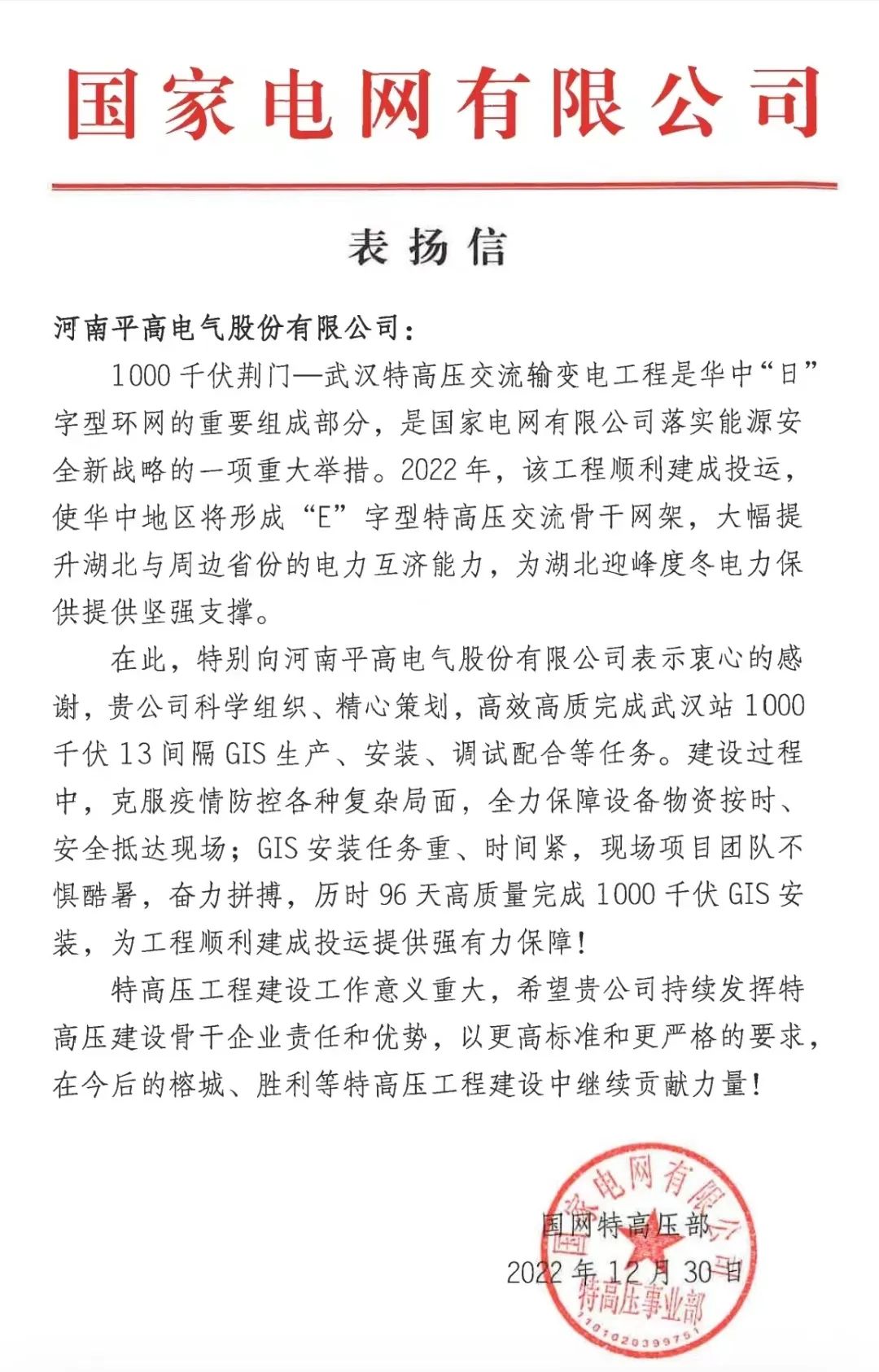 近日,平高電氣收到國網特高壓部表揚信,對高質高效完成武漢站1100千伏13間隔GIS生產、安裝、調試配合等任務表示衷心感謝。平高電氣克服疫情防控復雜局面,全力保障設備物資按時、安全抵達現場,歷時96天高質量完成現場安裝,為工程順利建成投運提供強有力保障,成為2022年唯一獲得表揚信的國網公司主設備廠家。