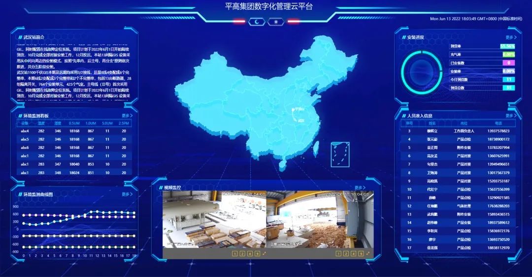 現場采用平高自主設計開發(fā)的現場數字化管控云平臺,首次在特高壓設備安裝過程中實現數字化管理,實現了安裝計劃管理、人員資質管理、移動廠房內環(huán)境監(jiān)測、關鍵作業(yè)數據實時上傳、數據自動匯總分析關鍵工序視頻記錄等9大功能。