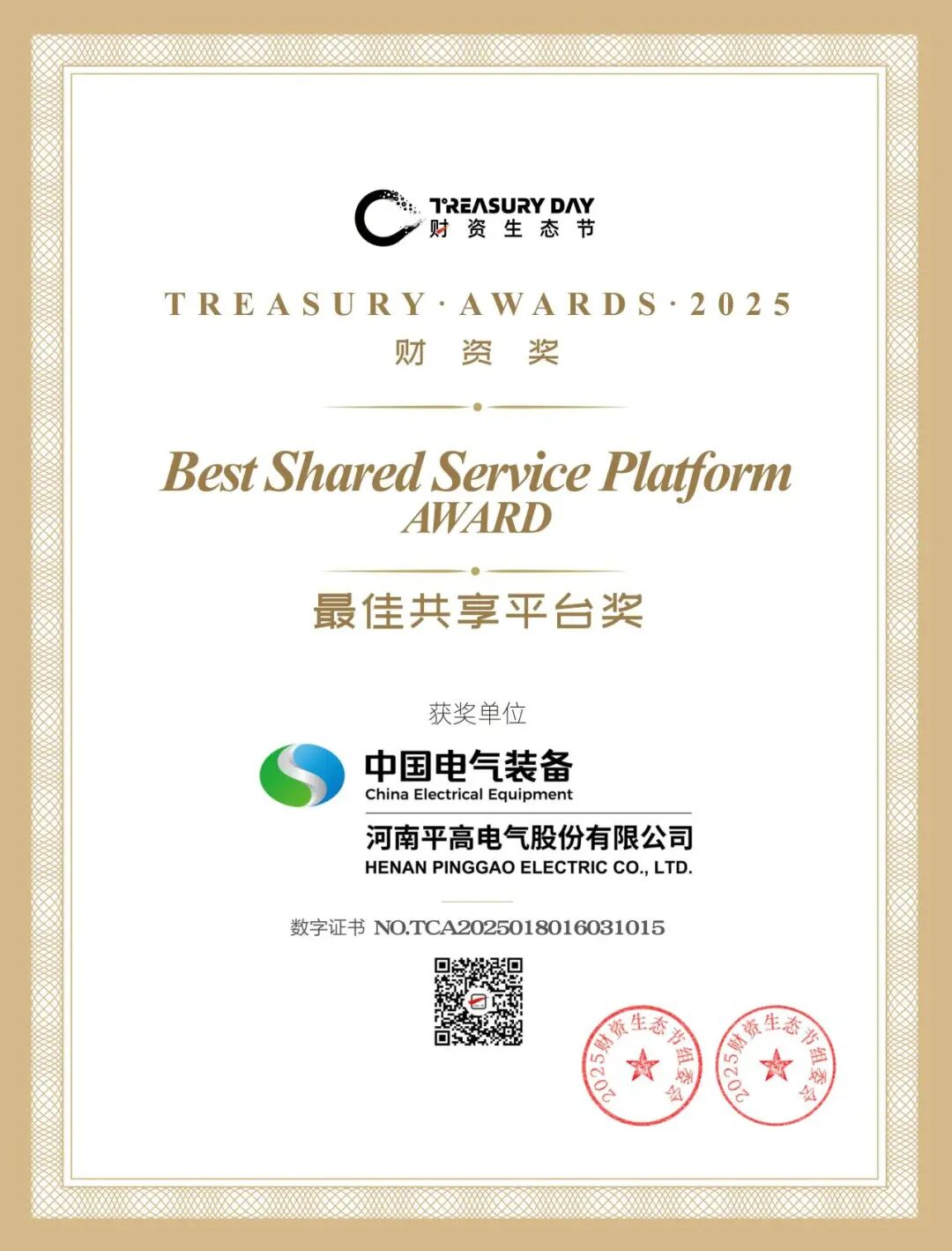 9月26日,平高電氣在第六屆財(cái)資生態(tài)節(jié)暨第十三屆中國(guó)財(cái)資年會(huì)的2025財(cái)資獎(jiǎng)(Treasury Awards 2025)評(píng)選中獲得“最佳共享平臺(tái)獎(jiǎng)”(Best Shared Service Platform Award)。該獎(jiǎng)項(xiàng)旨在表彰在財(cái)務(wù)共享中心建設(shè)方面具有出色表現(xiàn)的企業(yè),充分體現(xiàn)了業(yè)界對(duì)平高電氣財(cái)務(wù)共享創(chuàng)新實(shí)踐的認(rèn)可。