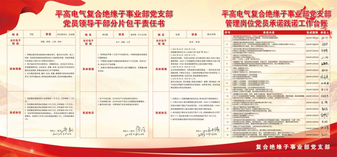 “承諾”不僅要上墻,更要上心。平高電氣復(fù)合絕緣子事業(yè)部同步開展黨員領(lǐng)導(dǎo)干部分片包干活動。領(lǐng)導(dǎo)干部簽訂《黨員領(lǐng)導(dǎo)干部分片包干責(zé)任書》。班子成員聚焦分管領(lǐng)域的年度重點(diǎn)工作,明確路線圖、制定時(shí)間表,掛圖作戰(zhàn),銷號管理,推進(jìn)重點(diǎn)工作落地落實(shí)。保證承諾有結(jié)果,踐諾有實(shí)效。