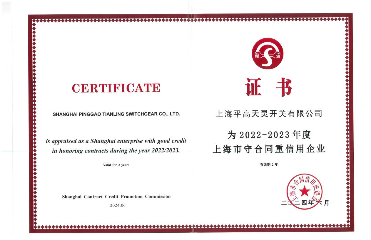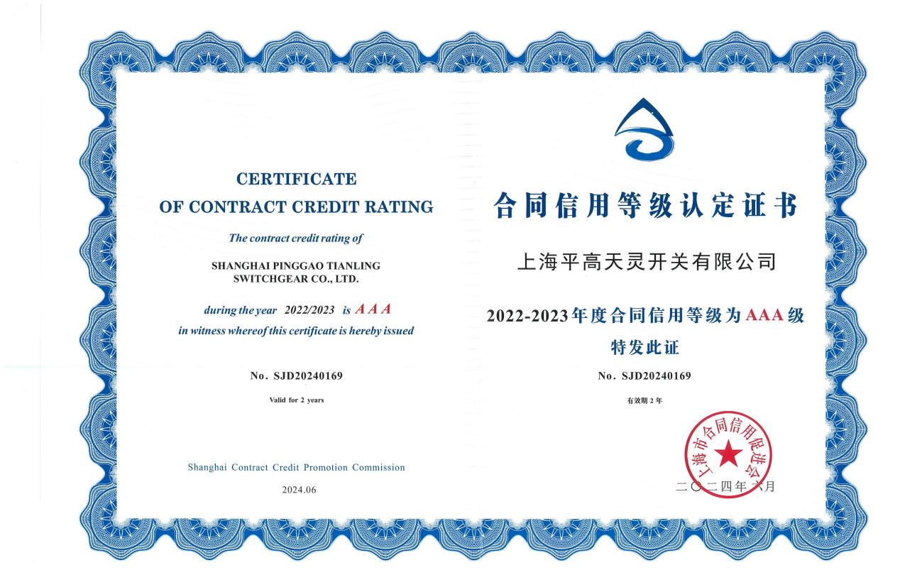 7月23日,從平高電氣所屬上海平高天靈開關有限公司(以下簡稱“上海平高”)傳來喜訊,上海市合同信用促進會公布了2022-2023年度上海市守合同重信用評定的結果,上海平高獲得守合同重信用企業(yè)和合同信用AAA級企業(yè)證書,這是上海平高連續(xù)5屆榮登榜單。