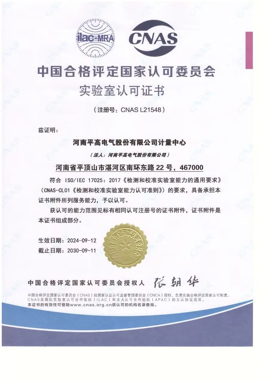 再獲國家認(rèn)可!平高電氣一個實(shí)驗(yàn)室通過CNAS資質(zhì)認(rèn)證!